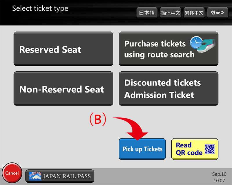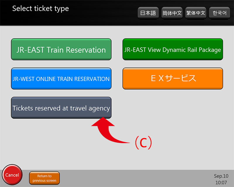 (C)「旅行会社で予約されたきっぷの受取り」を押します。