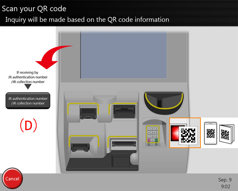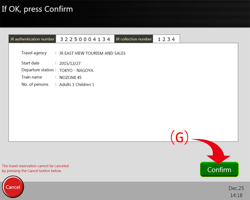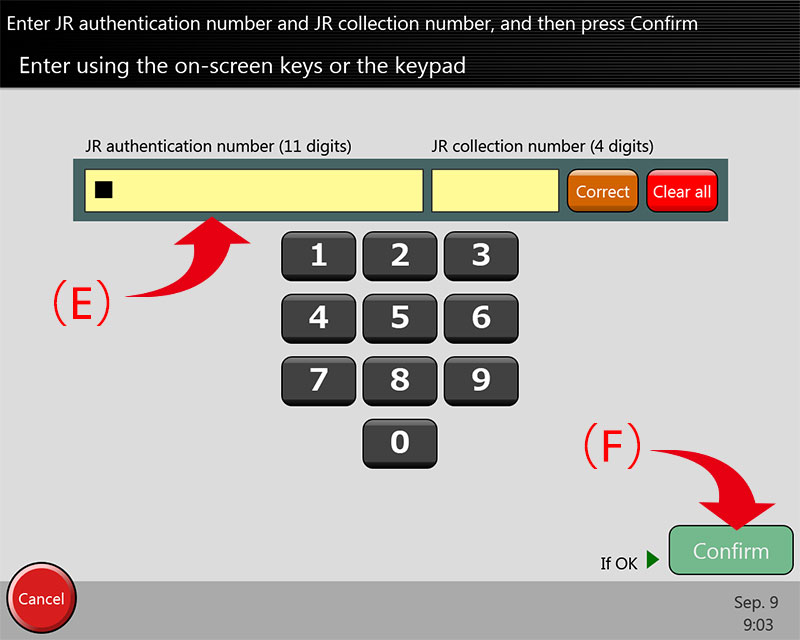 (E)お客様の「JR認証番号/JR引取番号」を入力し(F)の「確定」を押してください。