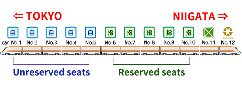 画像は、上越新幹線の列車が「とき」の場合の車両編成図です。青字の1号車~5号車までが自由席車両です。
