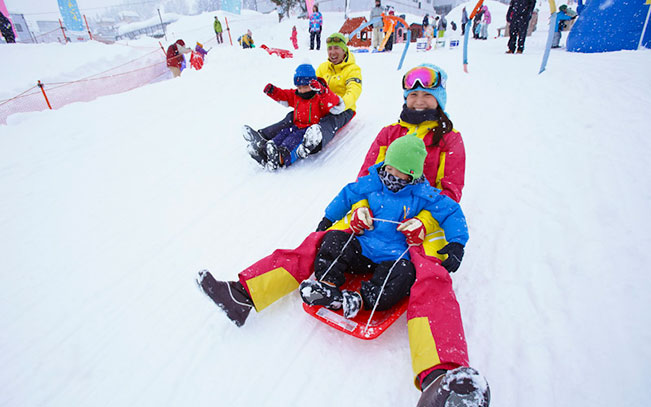 滑らなくても楽しめる「雪遊びパーク」が充実。ソリ遊びや雪だるま作りなど、初めての雪体験に最適です。