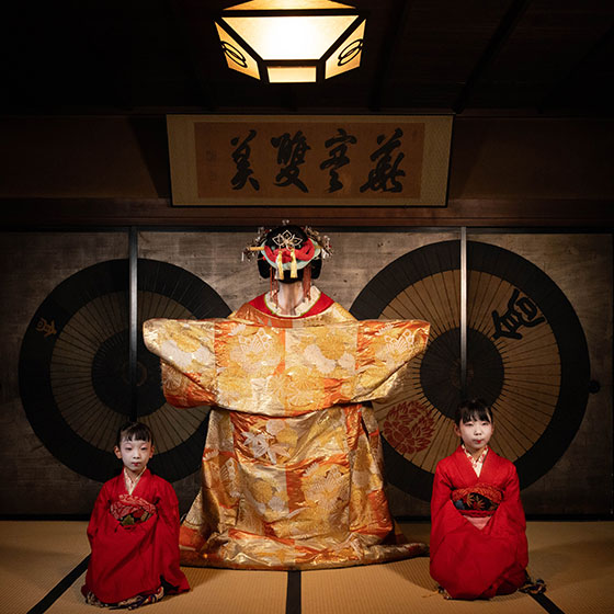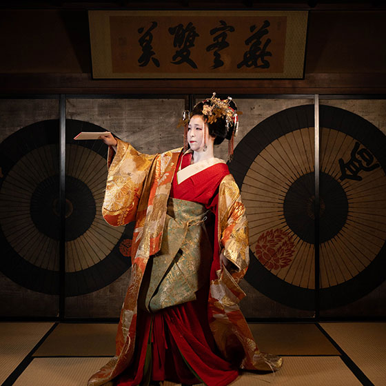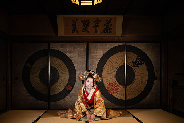 島原太夫が客人を迎える際の格式ある儀式。太夫が優雅に登場し、扇を使って挨拶する所作は古くからの美意識と礼節が凝縮されおり、舞台の一幕のような瞬間を輪違屋のお座敷でご覧いただきます。